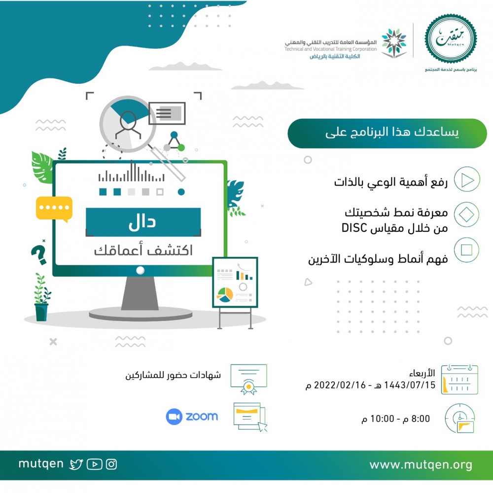 برنامج (دال) يأخذ المشارك إلى أعماق فهم الذات ليكشف له عن انماطه السلوكية ونقاط قوته وقدراته وإمكانياته من خلال من مقياس DISC أحد أشهر المقاييس العالمية احترافية وتمكن.